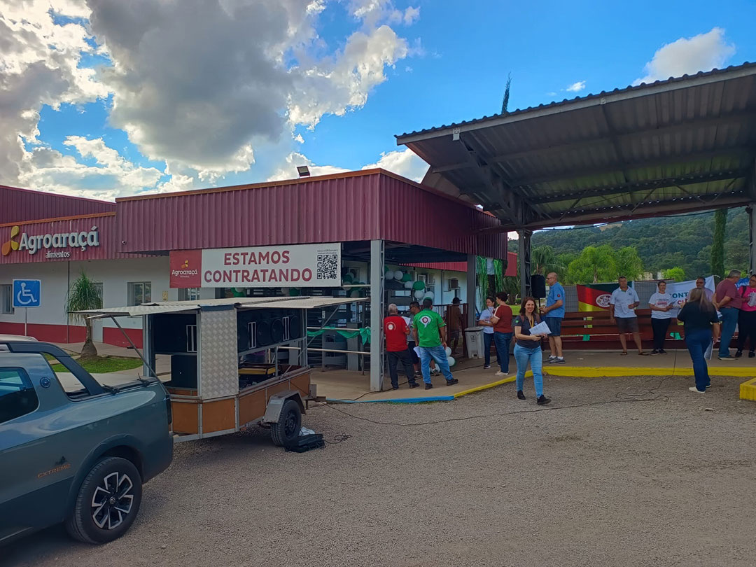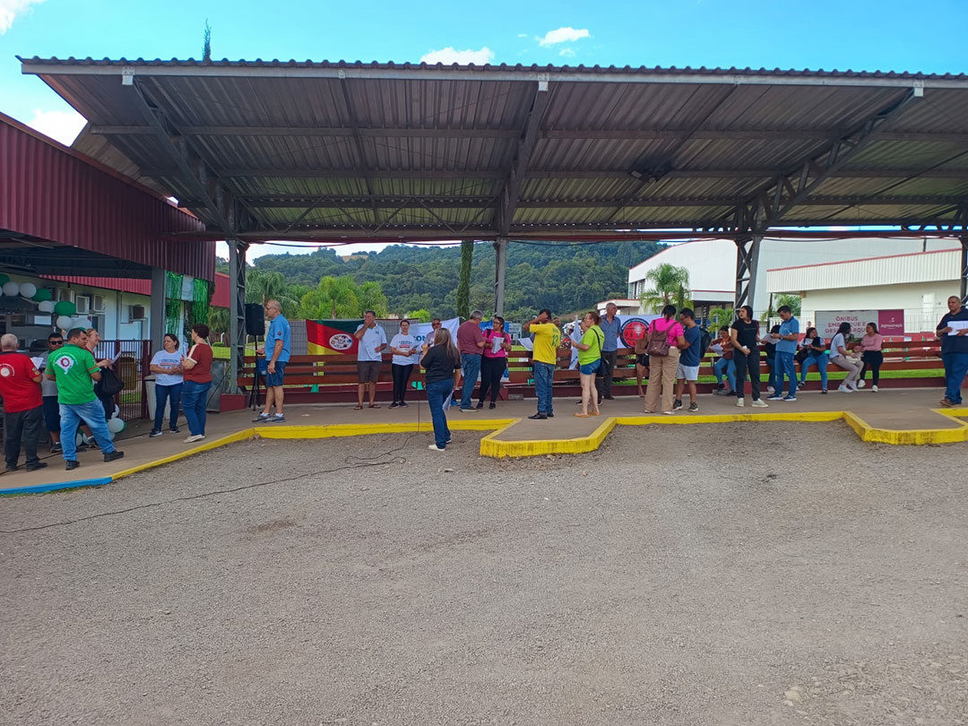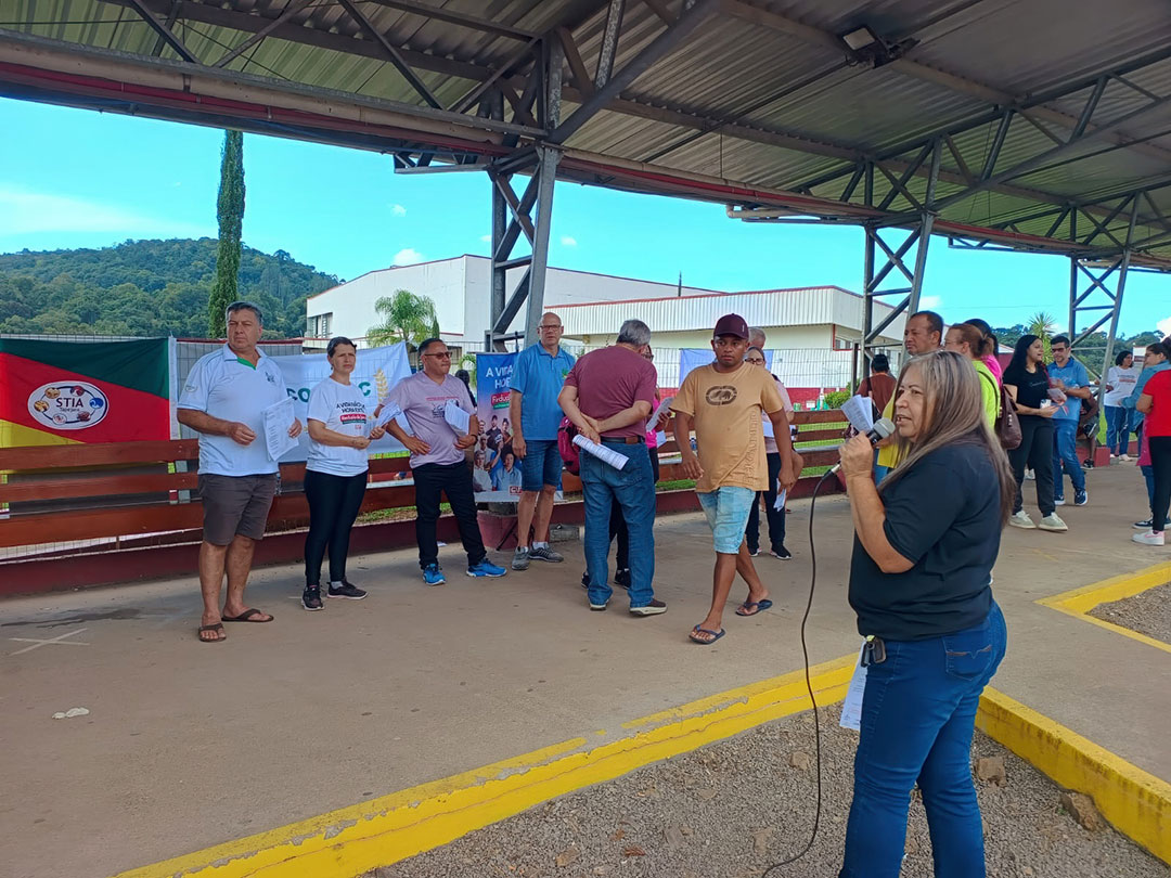 A luta pelos nossos direitos começa na porta da fábrica, com informação e união. Foi assim na panfletagem realizada no frigorífico LAR, em Nova Araçá, base do Sindicato de Serafina Corrêa.