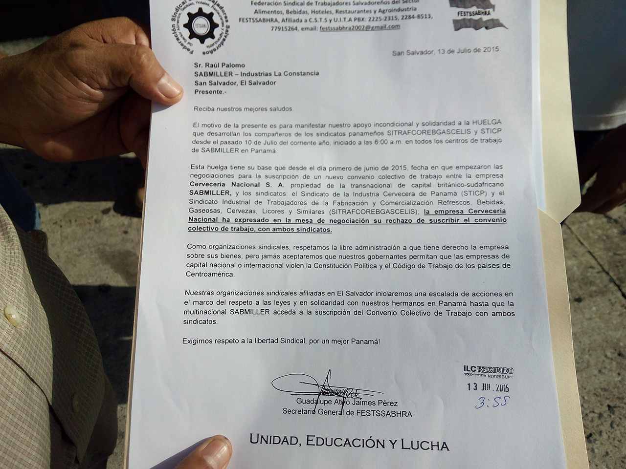 Mediante la presente queremos dar nuestro apoyo solidario a la lucha que están llevando a cabo los compañeros y compañeras por la suscripción de un nuevo convenio colectivo de trabajo entre la empresa Cervecería Nacional S.A. propiedad de la transnacional SABMiller y los sindicatos que representan a la clase trabajadora.