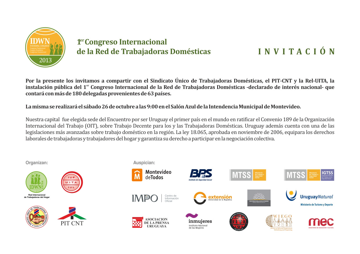 O evento, organizado pela Rel-UITA, em parceria com o Sindicato das Trabalhadoras Domésticas do Uruguai e com a central sindical única deste país, PIT-CNT, será em Montevidéu por ser o Uruguai o primeiro país que ratificou o Convênio 189 da Organização Internacional do Trabalho (OIT) sobre Trabalho Decente para os Trabalhadores/as Domésticos/as.