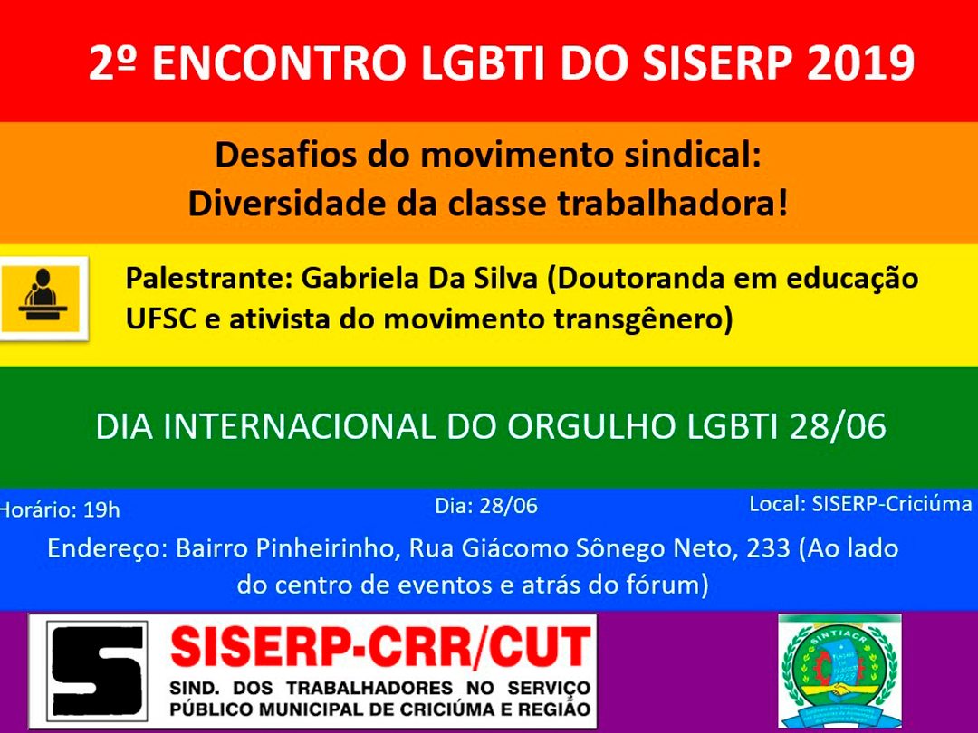 En conmemoración a este día el Sindicato de Trabajadores de la Industria de la Alimentación de Criciúma y Región (SINTIACR) junto a la Rel UITA participó del 2º Encuentro LGBTI del Sindicato de Trabajadores del Servicio Público Municipal de Criciuma (SISERP) el pasado viernes.