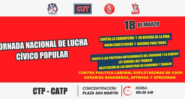 El próximo jueves 18 las cuatro principales centrales obreras del país −CTP, CGTP, CUT y CATP− organizan una jornada nacional de lucha exigiendo medidas ante la crisis derivada del Covid-19 y ante los incesantes casos de corrupción de los gobernantes.0 956