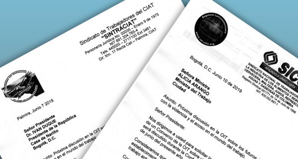 El Sindicato de Trabajadores del Centro Internacional de Agricultura Tropical (SINTRACIAT) y el Sindicato Nacional de Trabajadores de la Industria de las Bebidas (SICO), afiliados a la UITA, entregaron el lunes 10 una nota al presidente Iván Duque, con copia al Ministerio de Trabajo, solicitando la intervención del gobierno de Colombia en la redacción de un Convenio Internacional para la erradicación de la violencia y el acoso en el mundo del trabajo. 0 640